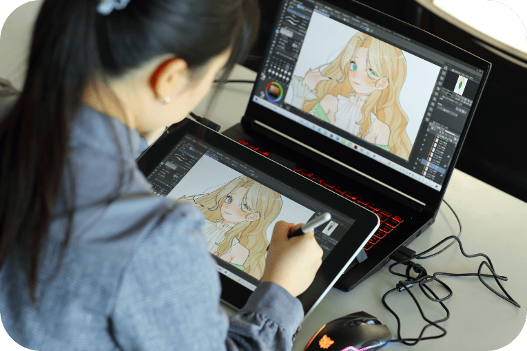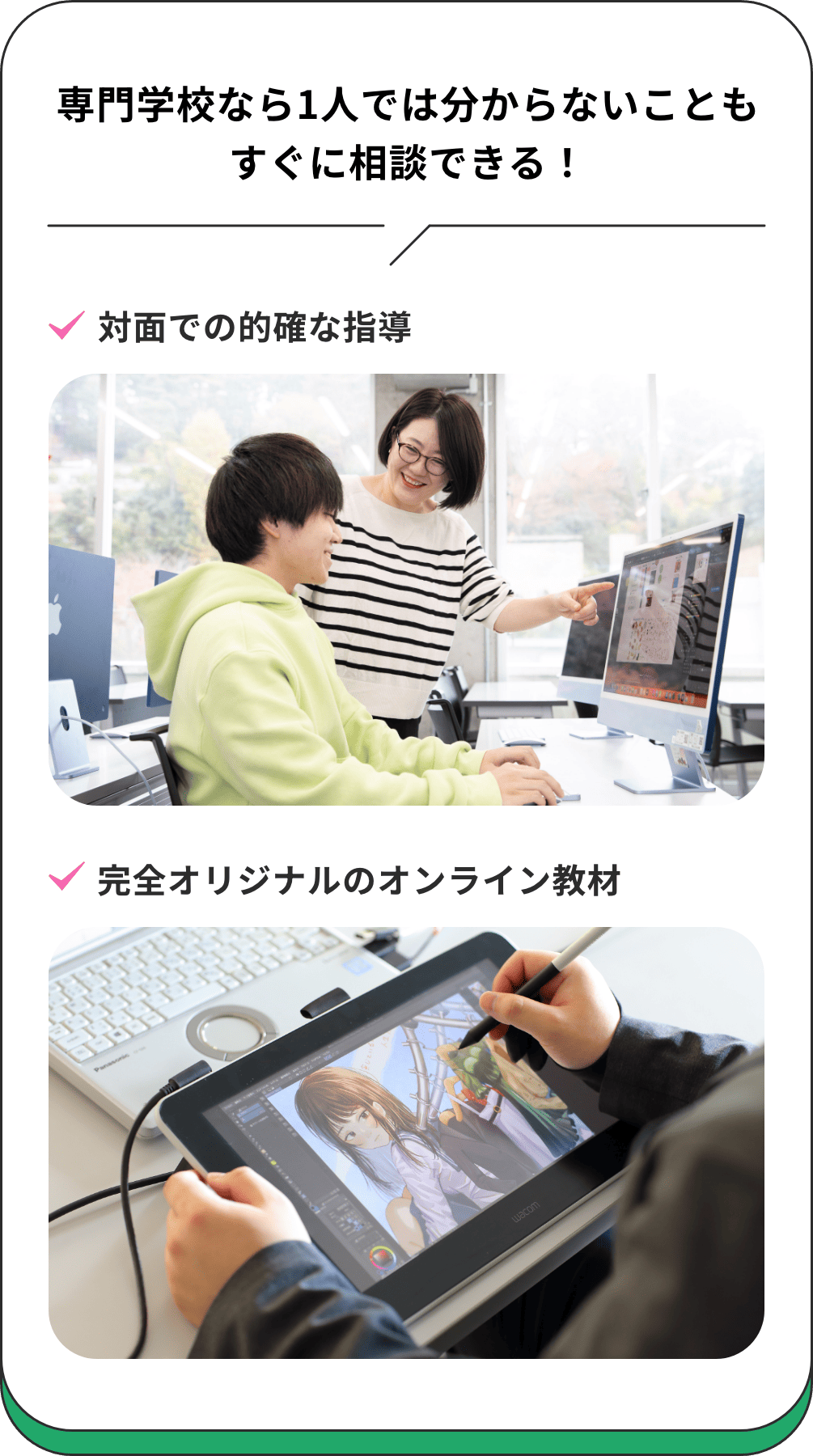 専門学校での対面授業でデザイン力を上げつつ、ピクシブ監修のイラスト講座や、