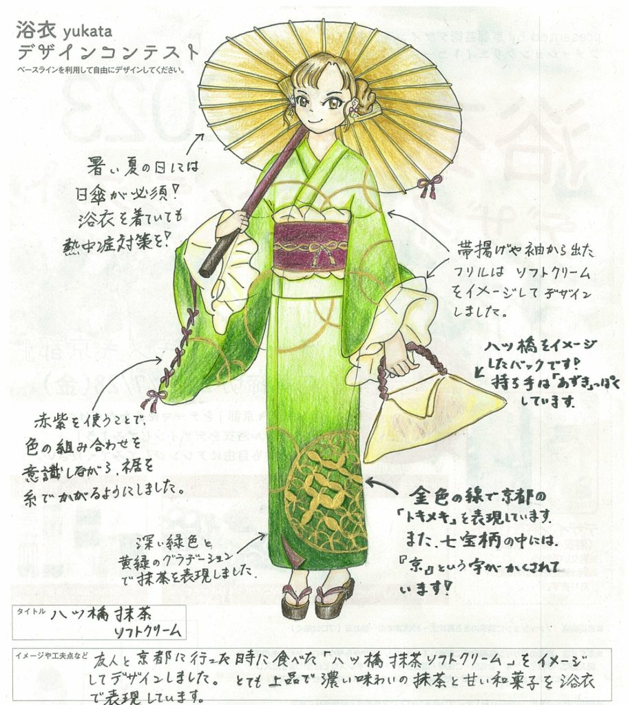 【審査員のコメント】 自身の京都の思い出を、浴衣という形にしてデザインしてくれました! 全体的な色のまとまりも感じられつつ、荷物を入れられる八ッ橋をイメージしたバッグ、 熱中症対策の日傘など、着る人への配慮も感じられるコーディネートになっています! 模様の一部に「京」の文字が隠れていたりと遊び心もあり楽しませてくれるデザインです。