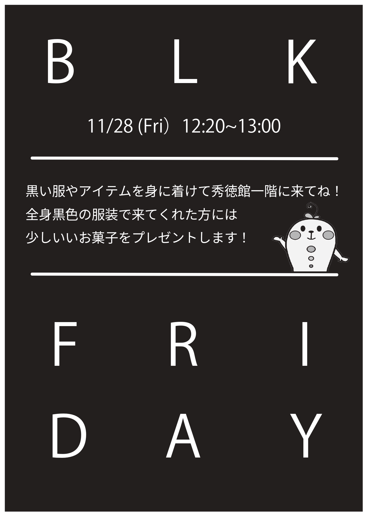 2025.11.25 【自治会】ブラックフライデーのお知らせ(11/28) こんにちは!自治会です!! 11月28日(金)に秀徳館ラウンジで『ブラックフライデー』を開催します!! みなさん黒い服やアイテムを身につけて、秀徳館ラウンジにお越しください‼︎ 黒さレベルに合わせてお菓子をプレゼント!! 1つ以上身につけた方 → お菓子 オールブラックの方 → 少し豪華なお菓子 ぜひ、みんなでブラックフライデーを盛り上げましょう! ————————– 日程:11月28(金) 時間:12時20分〜13時 場所:秀徳館1階ラウンジ ————————–